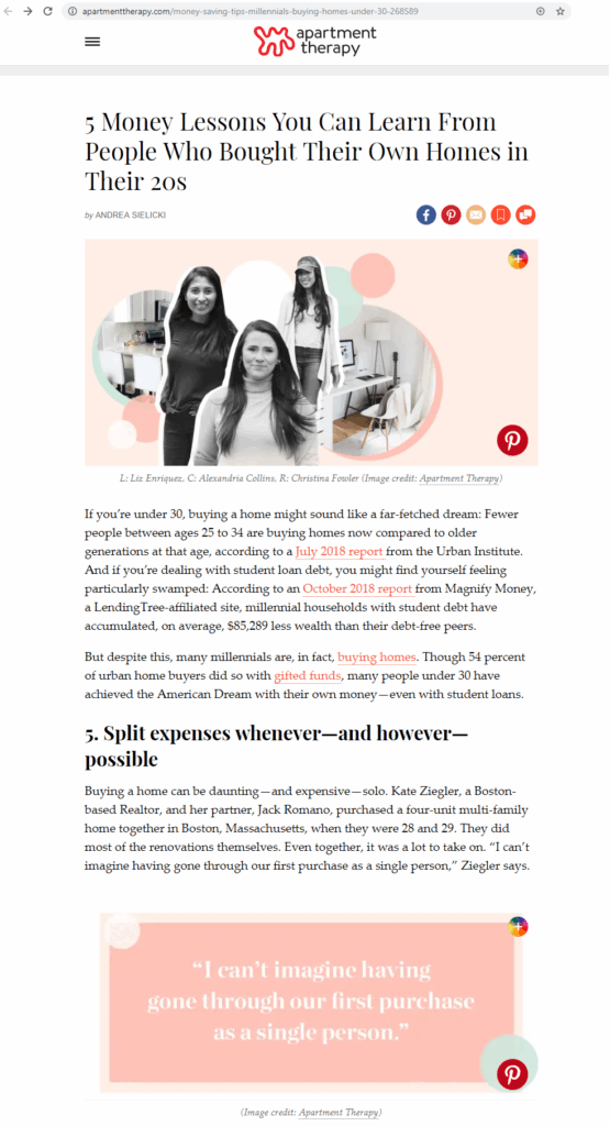 Buying a home can be daunting—and expensive—solo. Kate Ziegler, a Boston-based Realtor, and her partner, Jack Romano, purchased a four-unit multi-family home together in Boston, Massachusetts, when they were 28 and 29. They did most of the renovations themselves. Even together, it was a lot to take on. “I can’t imagine having gone through our first purchase as a single person,” Ziegler says.