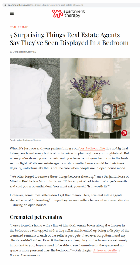 “I once toured a home with a line of identical, ornate boxes along the dresser in the bedroom, each topped with a dog collar and it ended up being a display of the cremated remains of each of the seller’s past pets. I’ve never forgotten it and my clients couldn’t either. Even if the items you keep in your bedroom are extremely important to you, buyers need to be able to see themselves in the space and no space is more personal than the bedroom.”—Kate Ziegler, Arborview Realty in Boston, Massachusetts