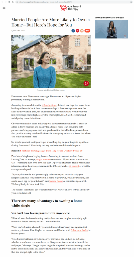 “Solo buyers will have no bickering over the basics of a kitchen, no debating whether a mudroom is a must-have, no disagreements over what to do with the wallpaper,” she says. “Single buyers might be surprised how much energy can be lost to these discussions in a coupled house hunt, and they can skip to the front of that line and get right to the offer.”